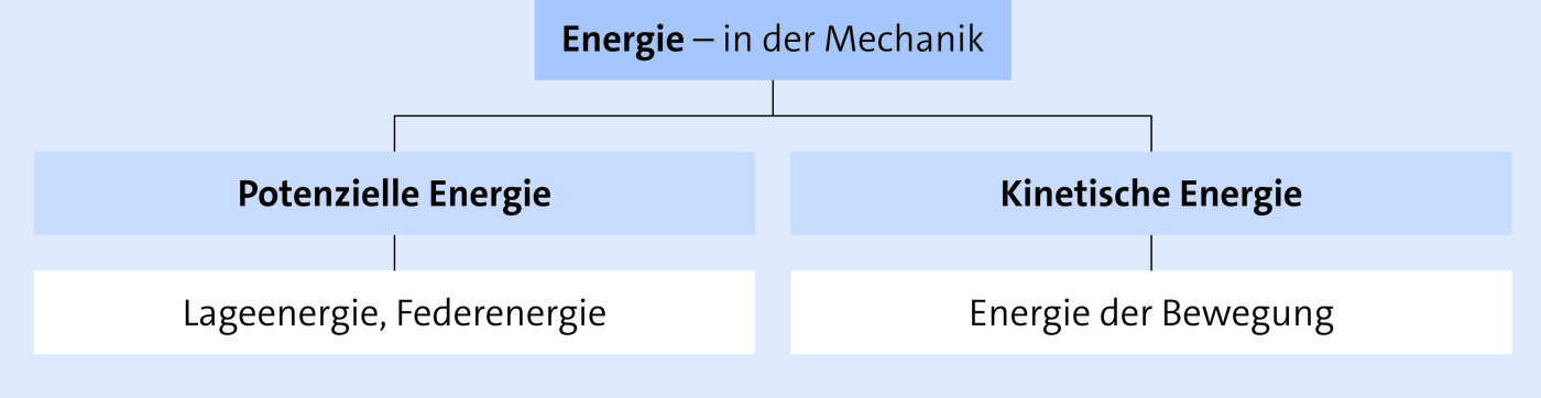 In der Mechanik wird zwischen potenzieller Energie (Lageenergie, Federenergie) und kinetischer Energie (Energie der Bewegung) unterschieden.