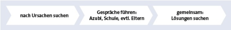 Eine Handlungsstrategie zur Reaktion auf eine Verhaltensauffälligkeit beim Auszubildenden kann z. B. in folgenden Schrittfolgen bestehen: