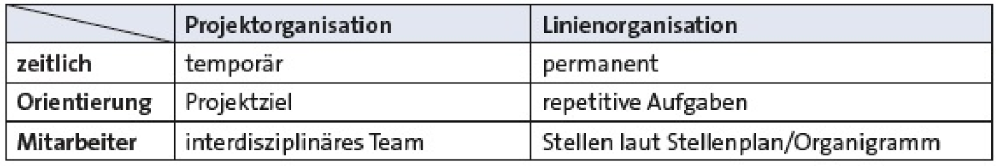 Für die Dauer eines Projektes kann eine eigene Projektorganisation aufgebaut werden oder das Projekt wird in der bestehenden Linienorganisation abgewickelt.