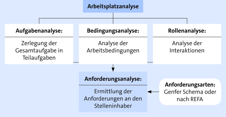 Aus diesen Teilanalysen wird die Anforderungsanalyse abgeleitet, d. h. welche Anforderungen werden an die Qualifikation des Stelleninhabers gestellt. Dabei wird in der Regel auf spezifische Anforderungsarten zurückgegriffen; üblich sind das Genfer Schema oder die Anforderungsarten nach REFA (vgl. unten):