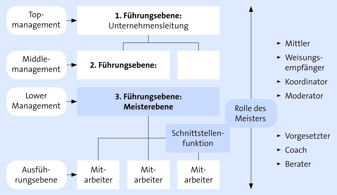 Der Meister hat einerseits die von der Unternehmensleitung vorgegebenen Ziele und die damit verbundenen Aufgaben wahrzunehmen und gleichzeitig – im Rahmen dieser Ziele – die Erwartungen der Mitarbeiter zu berücksichtigen.